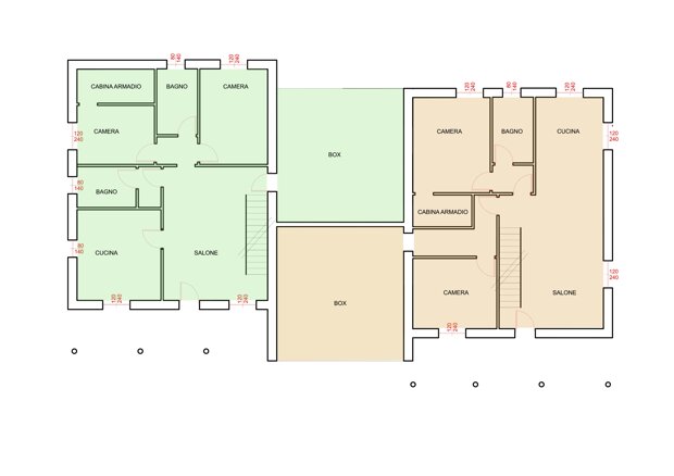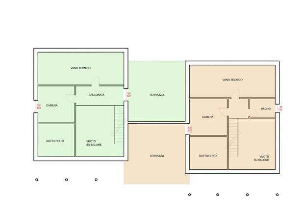 Ciascuna unita' e' cosi' formata: al piano terra si entra in un ampio salone living di circa 30 mq dal quale si accede alla cucina abitabile e al disimpegno; troviamo poi la camera da letto padronale con stanza armadio e bagno ed un'altra camera ed un altro bagno. Dal salone troviamo una scala a vista che porta al piano superiore dove trova posto un'altra camera ed un'ampia balconata con vuoto su salone, un vano tecnico ed un vano sottotetto che puo' fungere da ripostiglio. Dalla balconata si accede ad un magnifico terrazzo di 30 mq; ogni vano del piano terra esclusi i bagni hanno l'apertura verso il portico circostante la casa. Sempre al piano terra, ed esattamente sotto al terrazzo troviamo un 'ampia autorimessa di 30 mq dove possono alloggiare due auto ed una zona palestra o spazio per bici o moto. La villa insiste su un lotto di circa 500 mq ed e' caratterizzata da: PANNELLI FOTOVOLTAICI, POMPA DI CALORE, RISCALDAMENTO A PAVIMENTO, PREDISPOSIZIONE DI IMPIANTO DI CLIMATIZZAZIONE, PORTICO ESTERNO PIASTRELLATO, PORTONE SEZIONALE PER IL BOX. La peculiarita' aggiuntiva di questo immobile e' che essendo in fase di realizzazione e' possibile decidere la suddivisione interna (vedi esempio in planimetria dove si evidenziano due diverse soluzioni di disposizione interna)e le finiture. L'immobile viene consegnato ultimato chiavi in mano.
